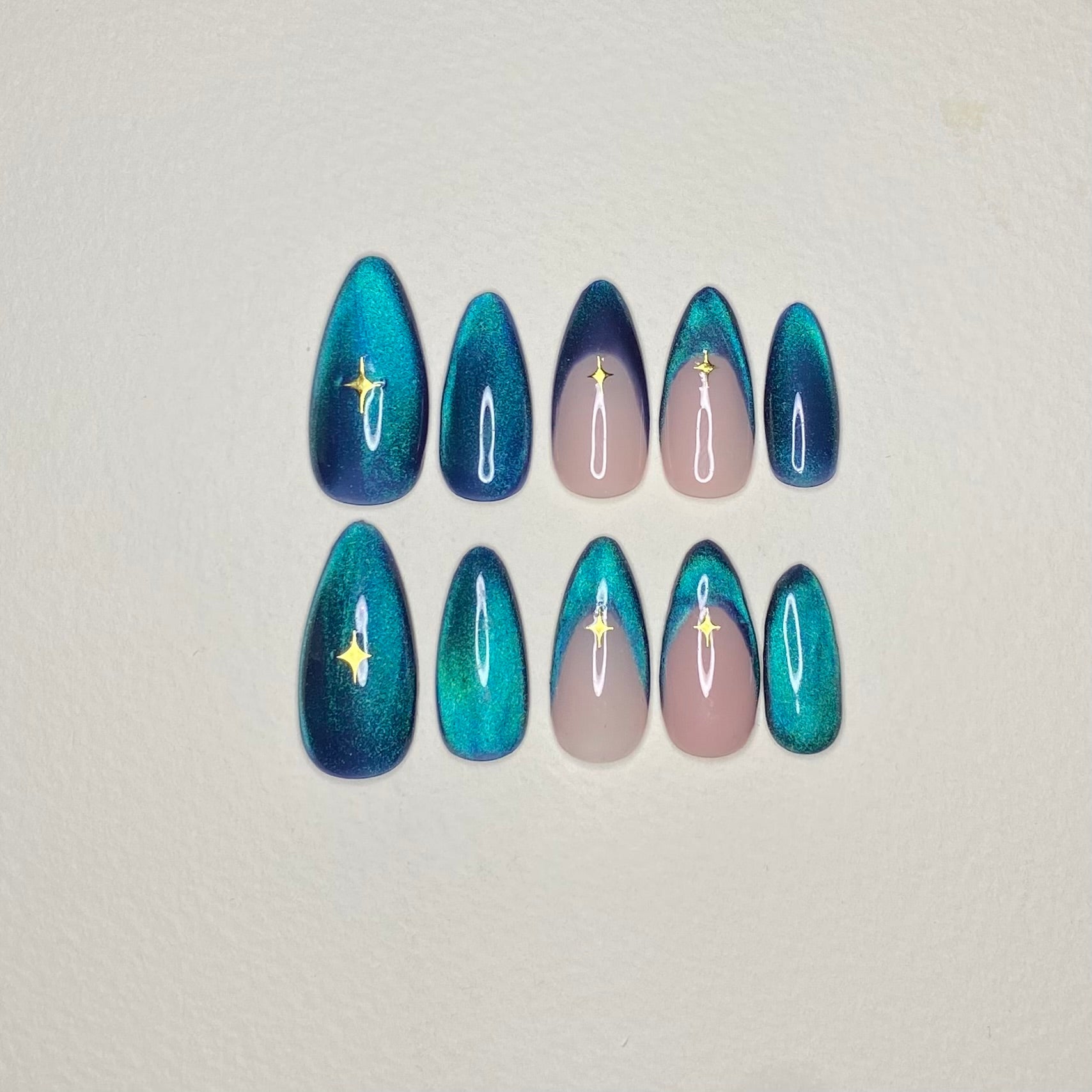 - Elements: Colour shifting cat-eye with french tip designs and golden stars.
