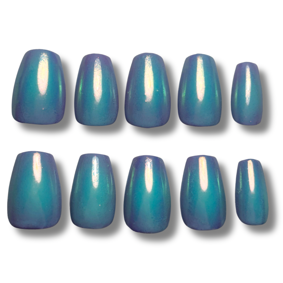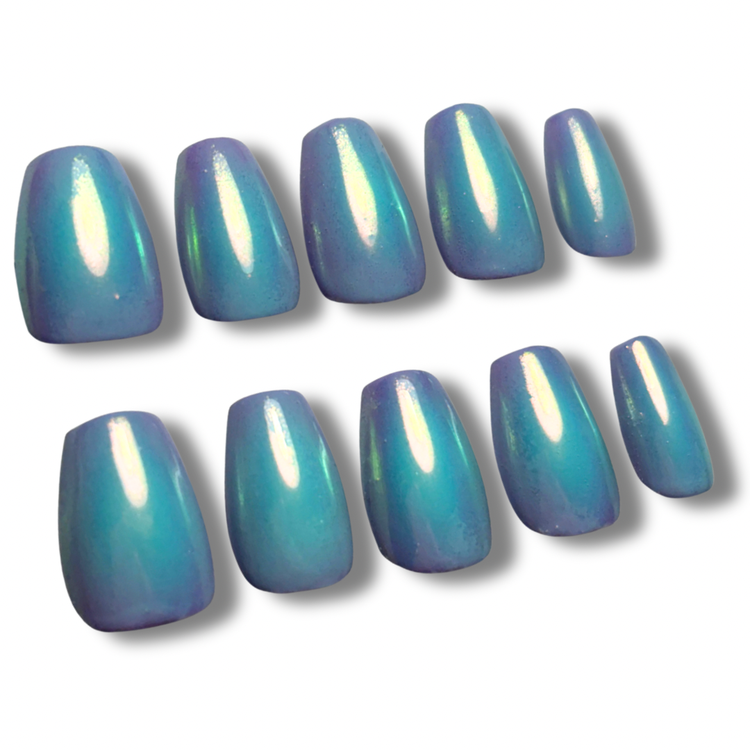 - Elements: purple gel with aqua aura and topped with iridescent chrome.