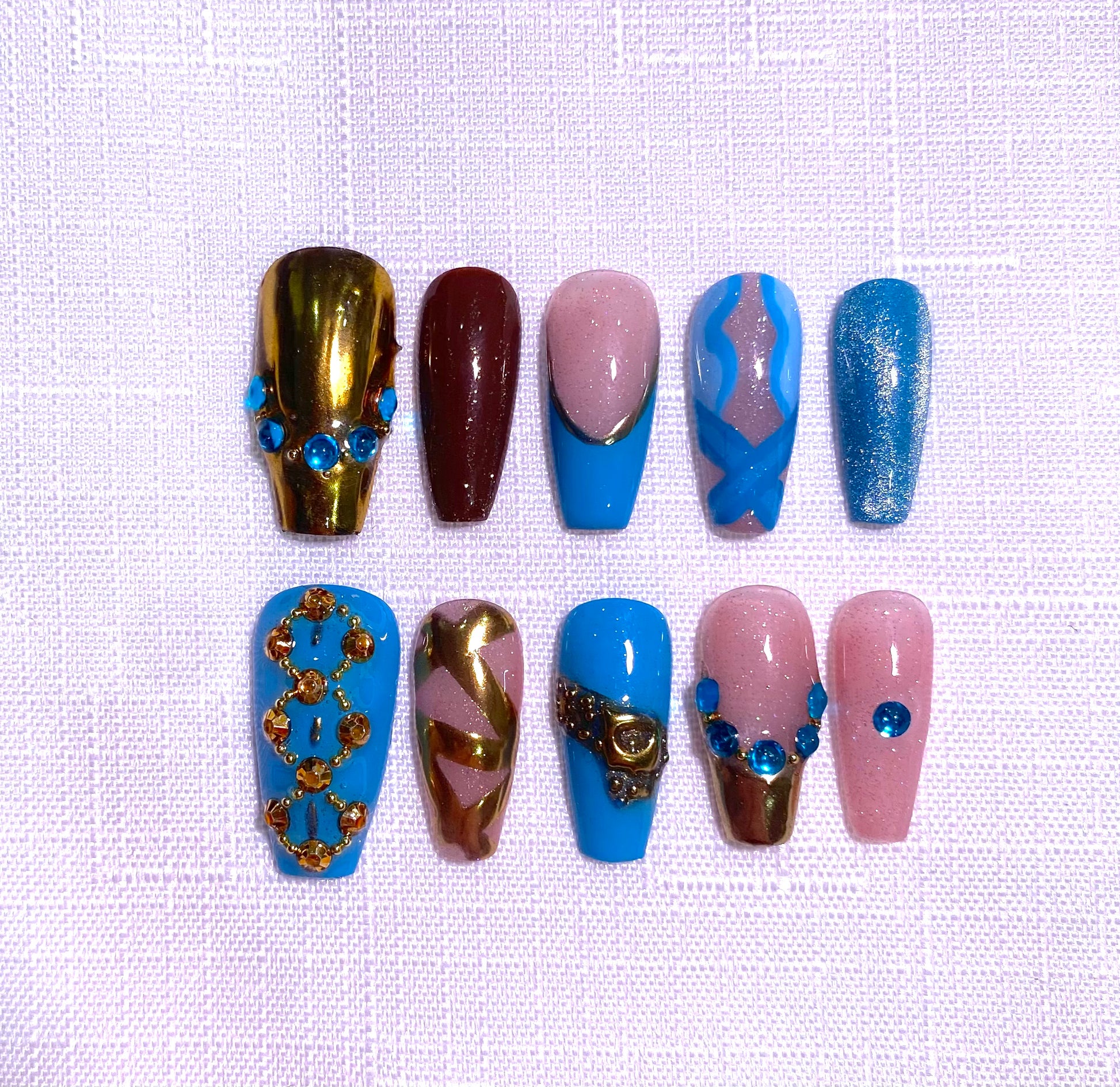 For custom sizing, please add the sizes of your nails in millimetres in an email with your name and order details in the order of: thumb, index, middle, ring, pinky. Example: 16mm, 12mm, 13mm, 12mm, 10mm.Ā