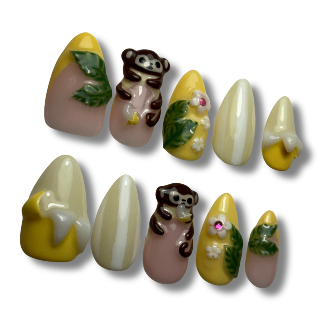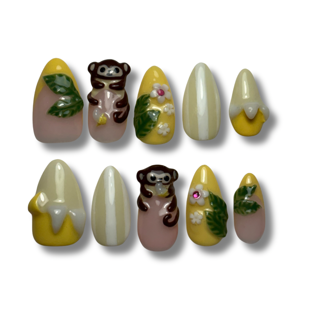 - Elements: 3d hand sculpted monkey peekaboo, hand sculpted banana peels and 3d flowers and leaf details