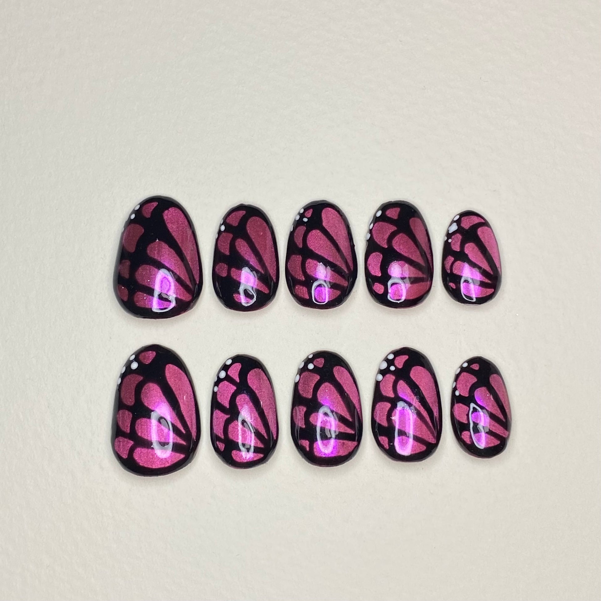 - Elements: Colour shifting cat-eye and hand drawn butterfly detailing, topped with pink iridescent chrome.