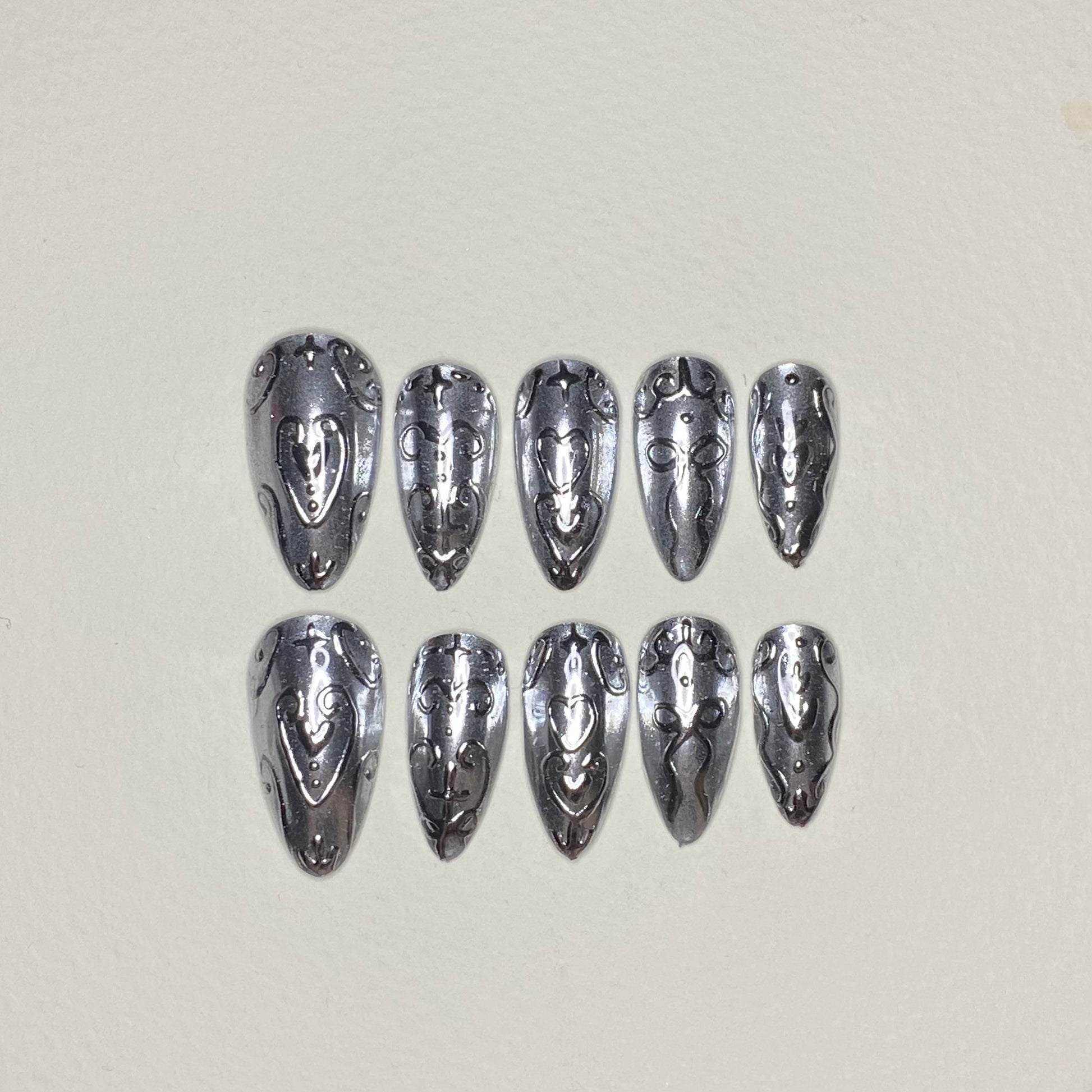 For custom sizing, please add the sizes of your nails in millimetres in an email with your name and order details in the order of: thumb, index, middle, ring, pinky. Example: 16mm, 12mm, 13mm, 12mm, 10mm.