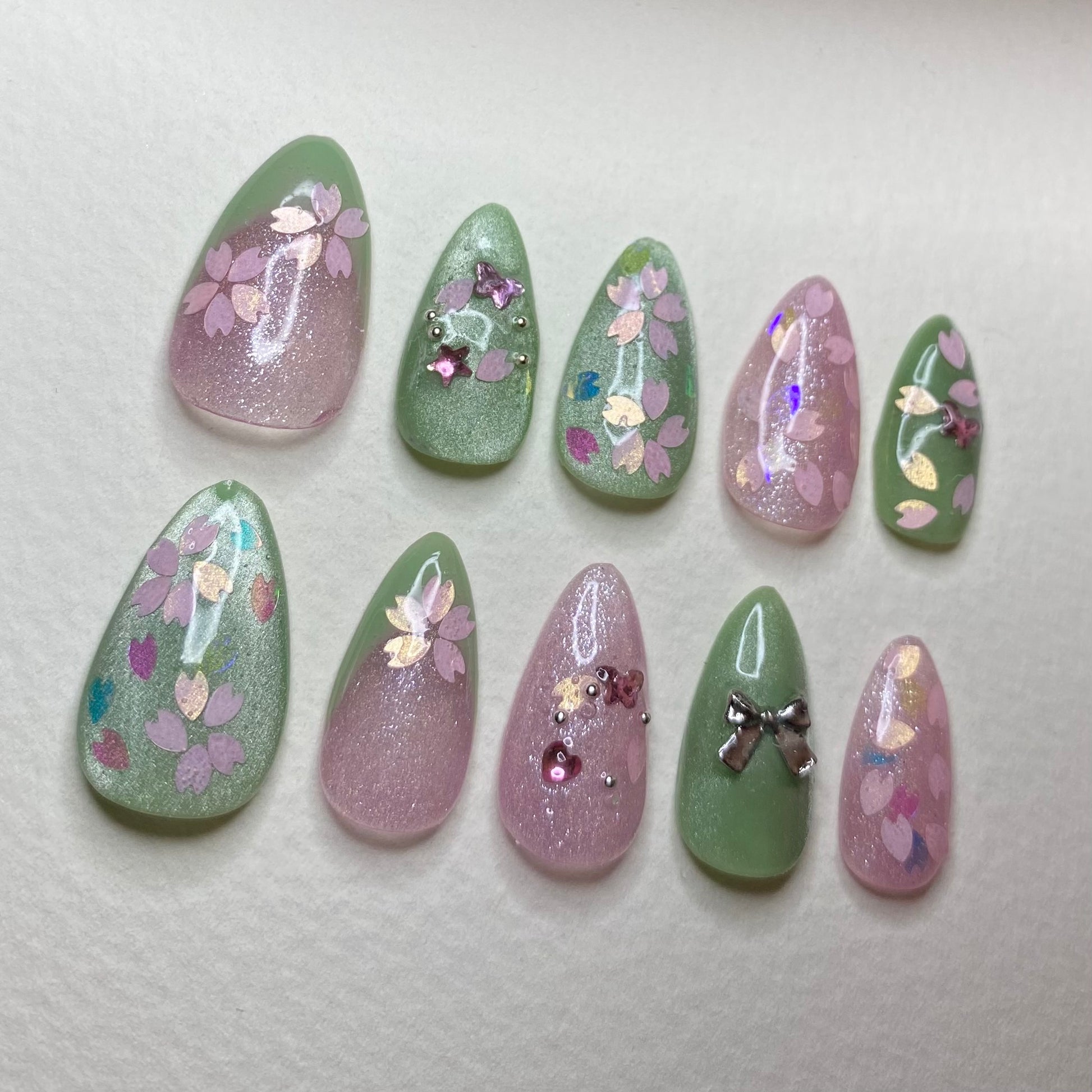 - Elements: green cat-eye, sakura glitters, french tips and 3d elements.