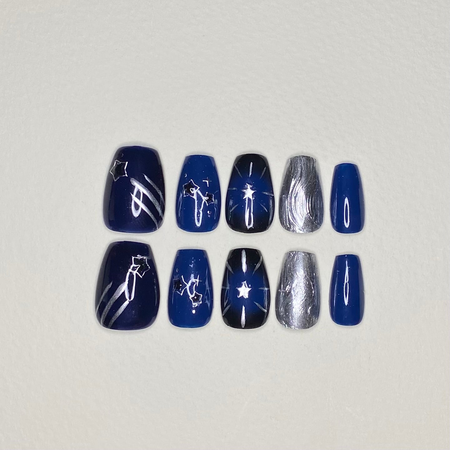 - Elements:Silver chrome waves, blue and black aura and star details.